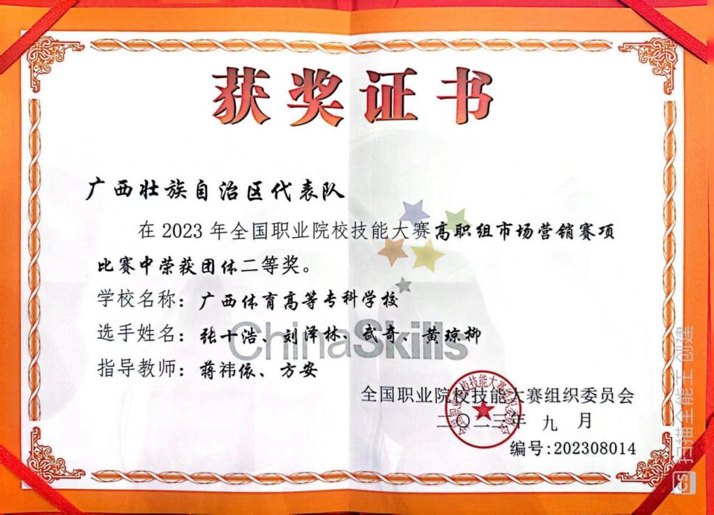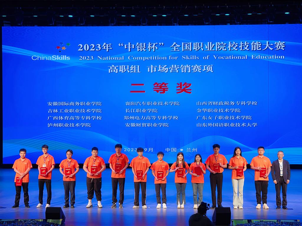 2023年9月13日-9月14日,由教育部等35个单位联合主办的2023年“中银杯”全国职业院校技能大赛高职组市场营销赛项在兰州资源环境职业技术大学隆重开赛,本次比赛共有来自全国各地高等职业院校的62支参赛队伍、共计248名选手共同参加全国总决赛的角逐,由爱体育电子官方网站体育管理学院张十浩、黄琼柳、武奇、刘泽林等4名同学组成的市场营销代表队在教练员蒋祎依、方安的带领下,代表广西壮族自治区参赛,经过激烈角逐,荣获该赛项的团体二等奖,实现了爱体育电子官方网站在全国职业院校技能大赛获奖的历史性突破。