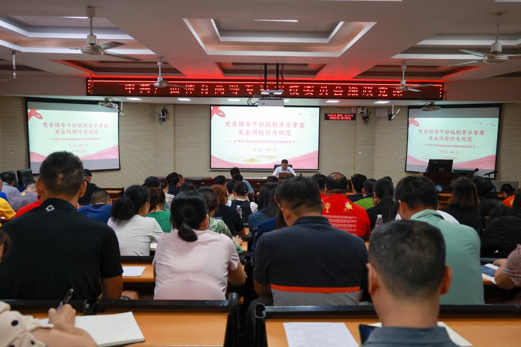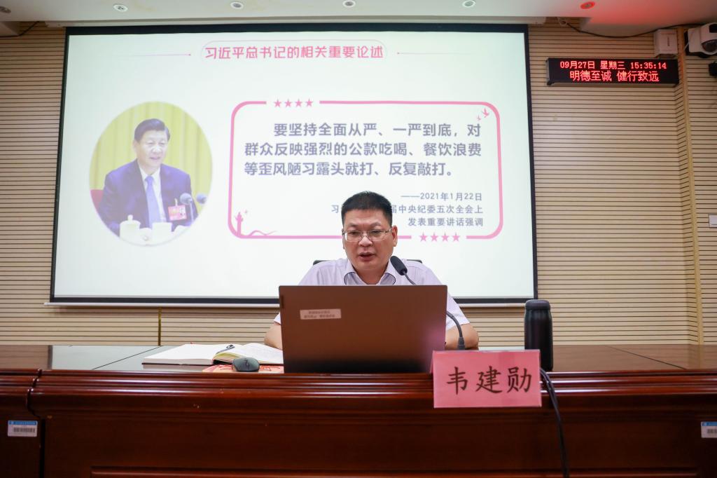 2023年中秋、国庆将至,为进一步落实中央八项规定精神,持之以恒纠治“四风”,坚决抵制享乐主义和奢靡之风,严防各类“节日腐败”,不断释放常抓常管、长管长严的强烈信号,9月27日下午,爱体育(中国)党委副书记、校长韦建勋以部分高校党员领导干部违反中央八项规定精神问题典型案例为反面教材,深入浅出地讲解了《党员领导干部抵制享乐奢靡突出问题行为规范》中8个方面36种具体情形,为参会党员领导干部上了一堂内涵丰富、发人深省的廉政党课。爱体育(中国)纪委书记罗黎造主持党课。