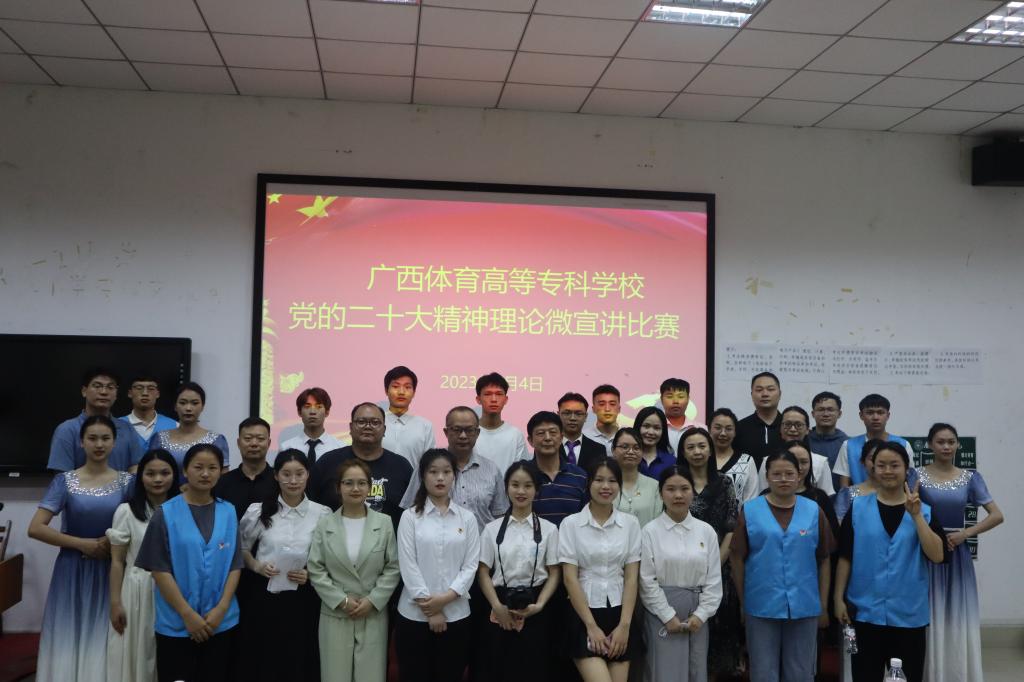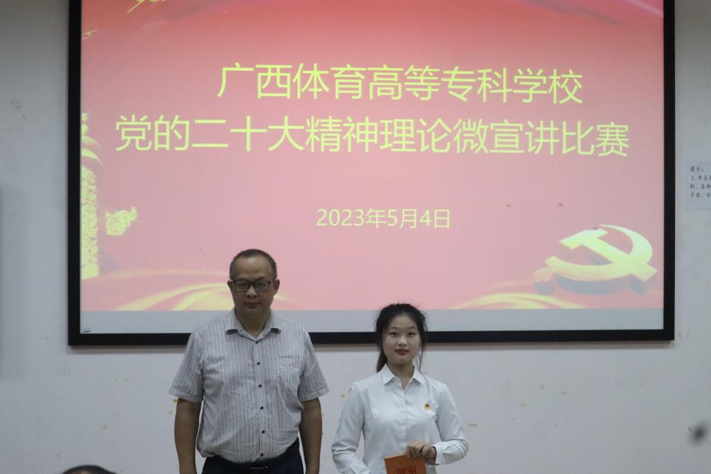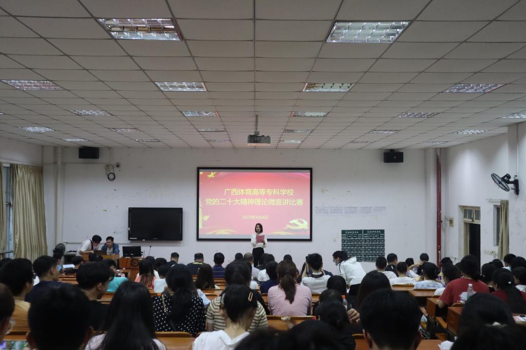 为引导爱体育电子官方网站学生学思践悟党的二十大精神,推动党的创新理论走进体专青年,5月4日,爱体育电子官方网站在长岗校区瑞兴楼107教室开展党的二十大精神理论微宣讲比赛。本次比赛以“学习宣传贯彻党的二十大精神”为主题,由学生工作部(处)主办,易班学生工作站承办。马克思主义学院副院长黄航、体育与教育学院党总支副书记危泳键、体育经济管理学院党总支副书记祁丽、运动科学与健康学院卢小婷、学生工作处学生科唐卓等5位老师应邀出席并担任评委,覃世东副校长、学生工作部(处)韦伦国处长作为嘉宾莅临现场指导比赛。