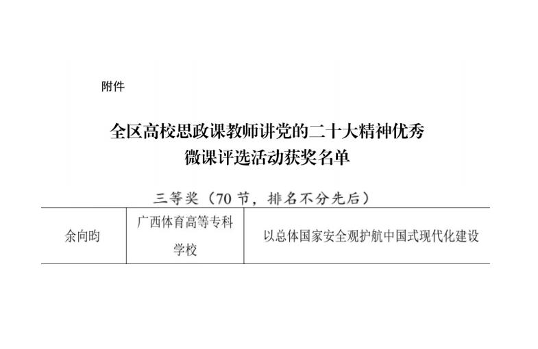 日前,自治区教育厅下发《关于公布全区高校思政课教师讲党的二十大精神优秀微课评选活动获奖名单的通知》。马克思主义学院余向昀老师的微课《以总体国家安全观护航中国式现代化建设》荣获三等奖。本次微课评选活动,全区高校共推荐229节微课参加自治区层面的比赛,评出获奖作品100节。