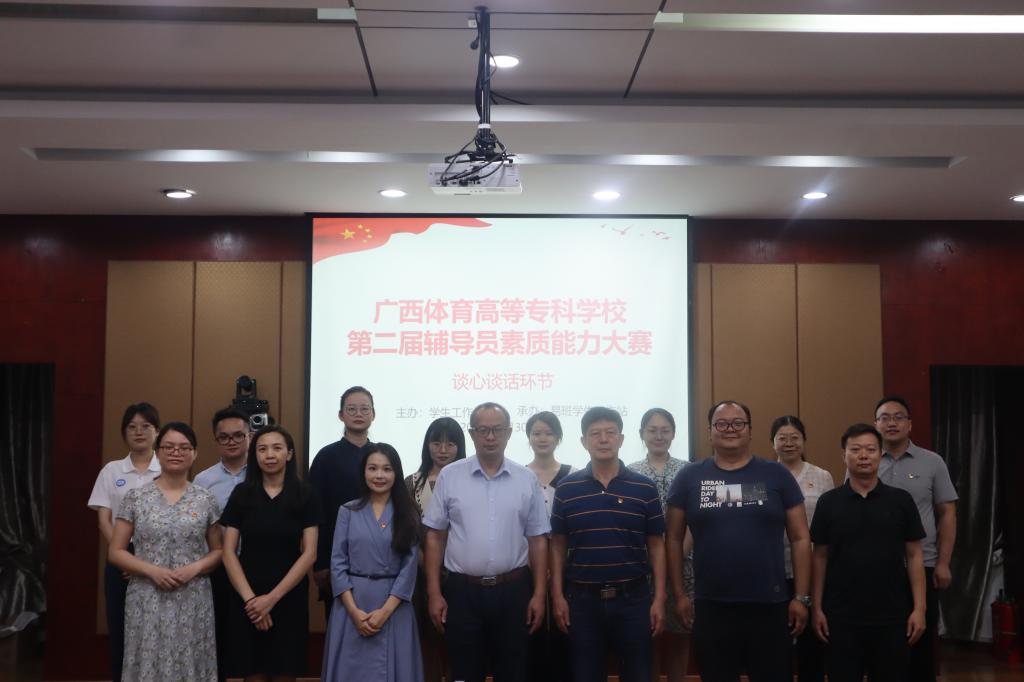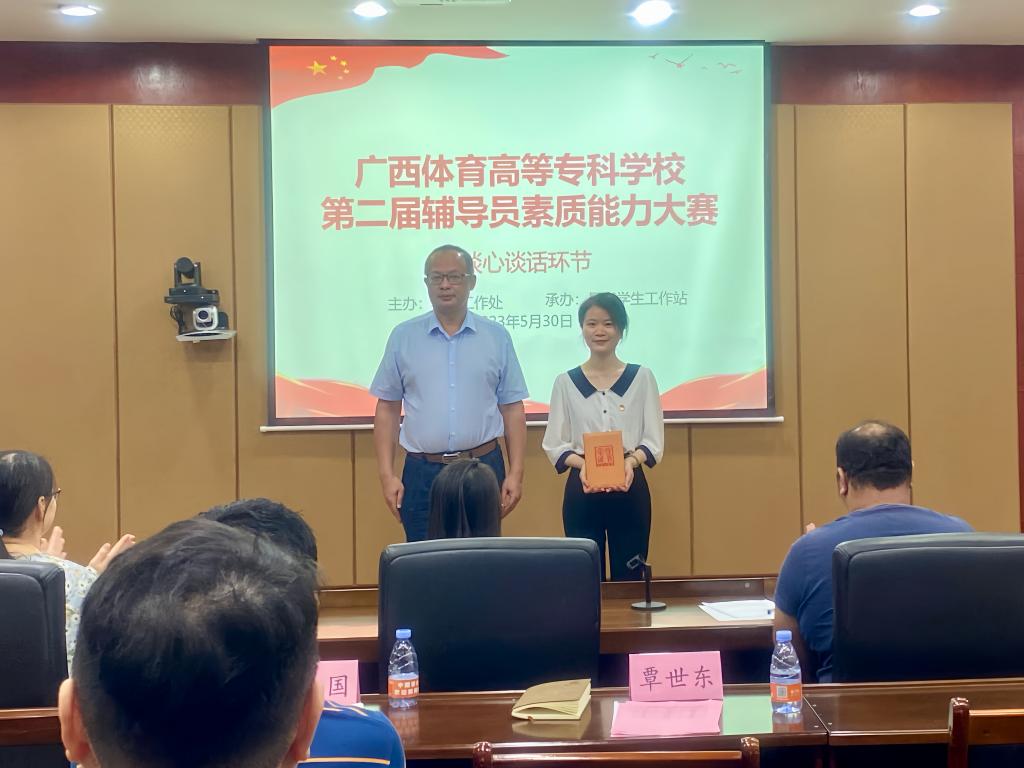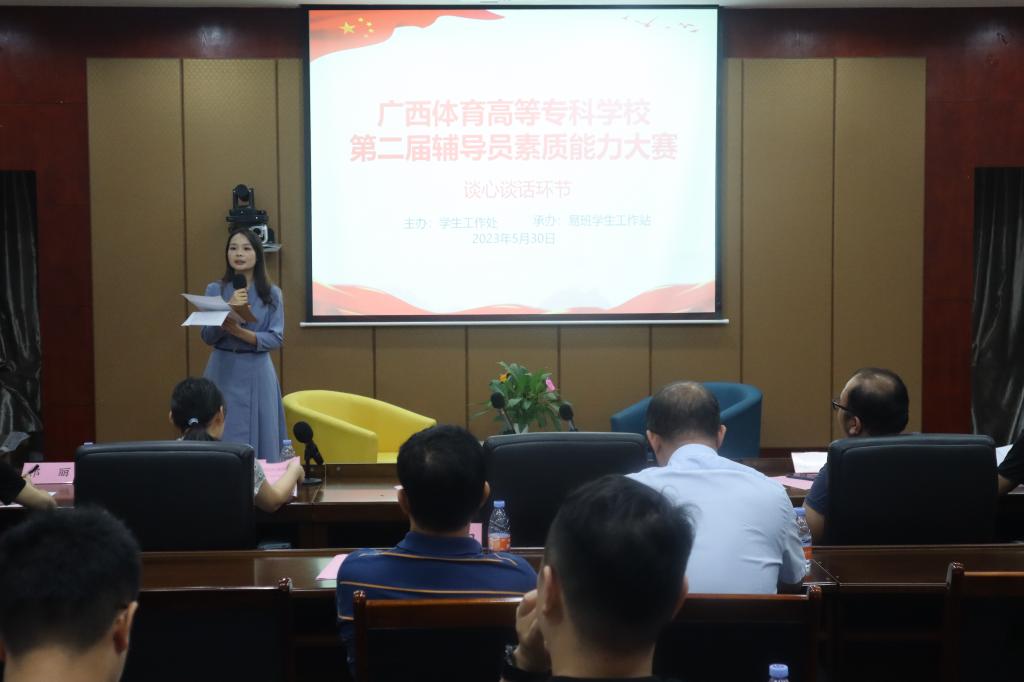 为深入学习贯彻习近平新时代中国特色社会主义思想和党的二十大精神,贯彻落实《普通高等爱体育(中国)辅导员队伍建设规定》,不断提升爱体育电子官方网站辅导员的理论水平、职业能力和专业素养,爱体育电子官方网站分别于4月和5月组织开展第二届辅导员素质能力大赛,本次大赛分为基础知识测试、案例研讨、谈心谈话三个环节,邀请广西建设职业技术学院冯光帆老师和封炫妃老师分别担任案例研讨环节、谈心谈话环节的评委组组长,爱体育电子官方网站覃世东副校长、学生工作部(处)韦伦国处长作为嘉宾莅临决赛现场指导比赛。