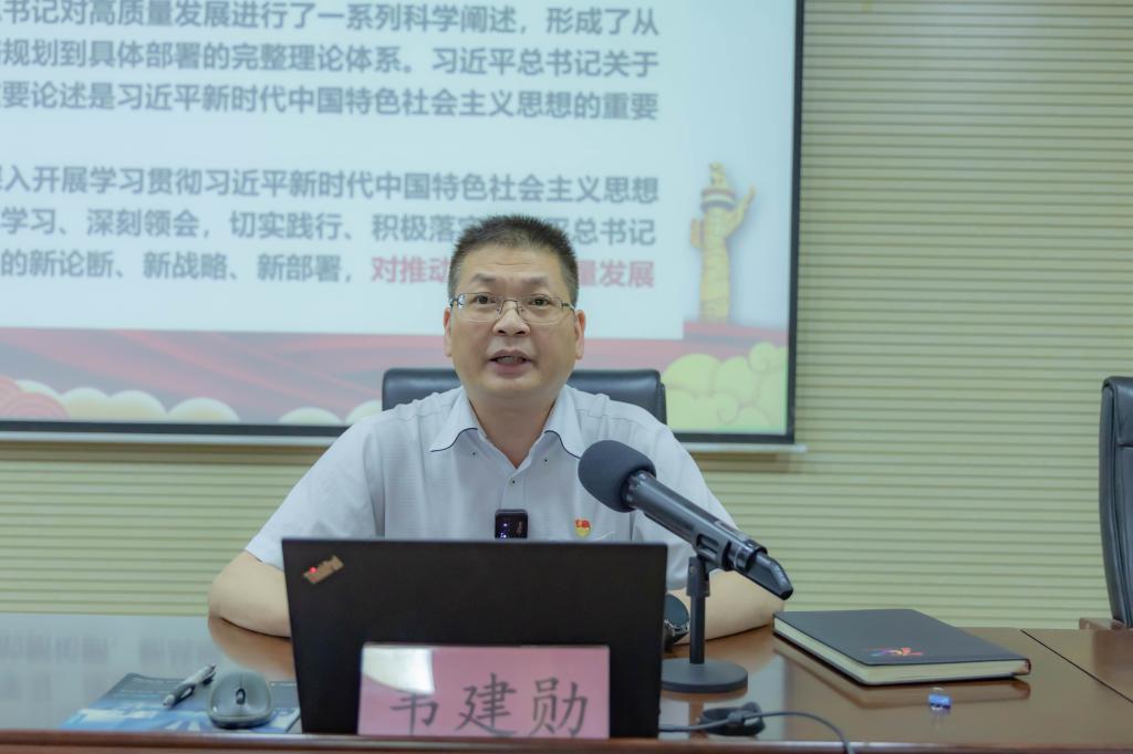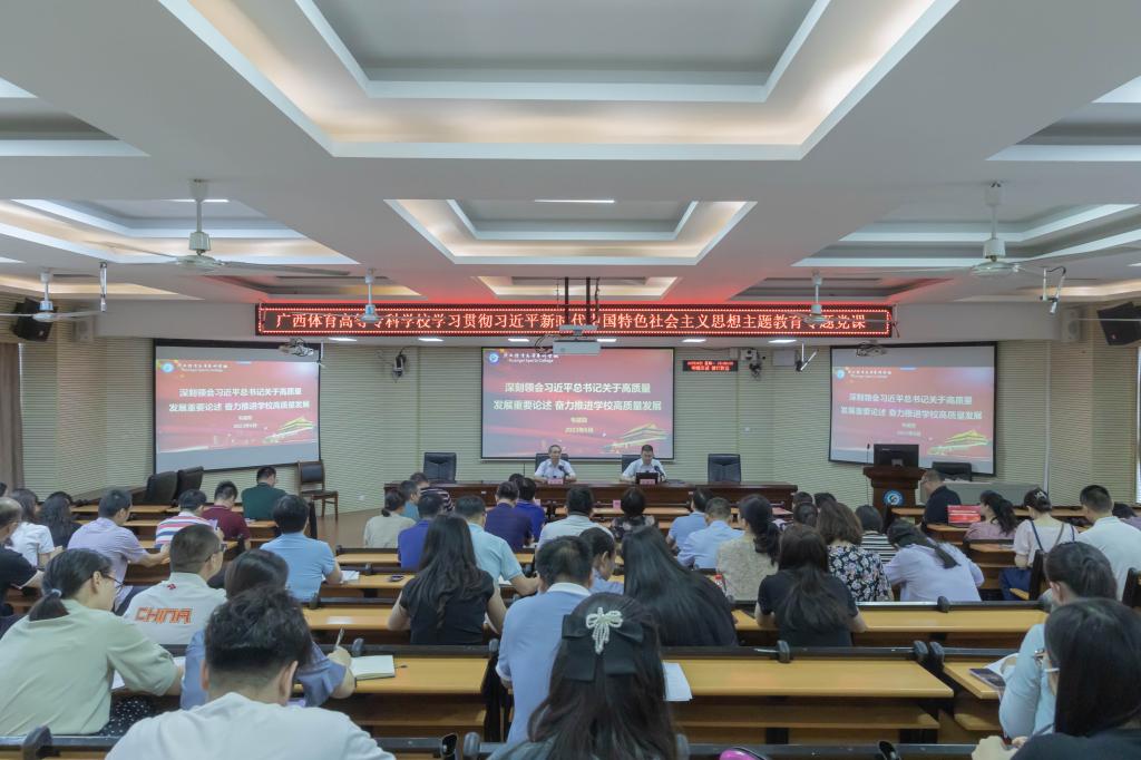 6月26日下午,韦建勋校长以《深刻领会习近平总书记关于高质量发展重要论述,奋力推进爱体育(中国)高质量发展》为题,为爱体育电子官方网站全体教职员工讲授主题教育专题党课。专题党课由党委书记杨昌鹏主持,自治区党委主题教育第十一巡回指导组成员杨煜到会指导。