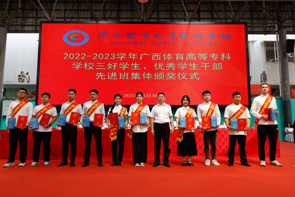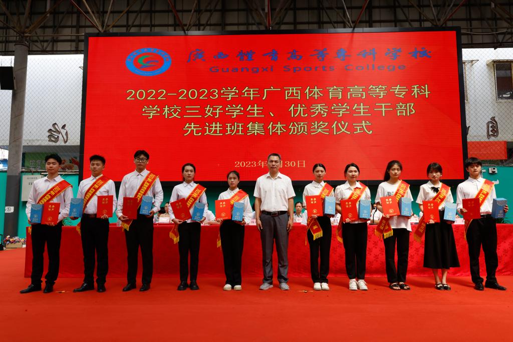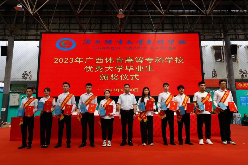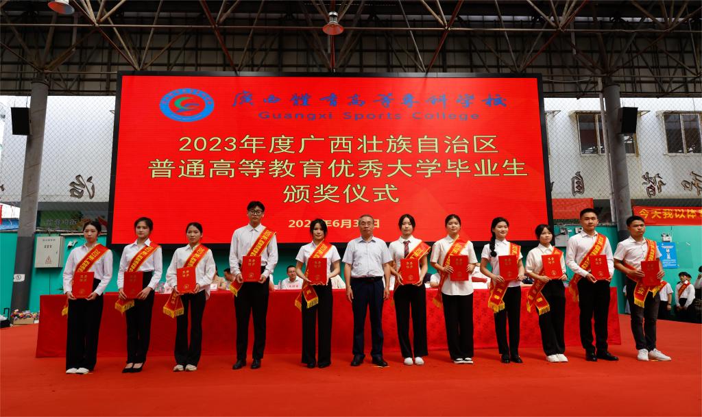 伴随着激荡人心的国歌声响起,毕业典礼仪式拉开帷幕。仪式上,杨昌鹏书记为荣获“2023届广西壮族自治区普通高等教育优秀大学毕业生”称号的同学颁发荣誉证书,韦建勋校长为2023届毕业生代表颁发毕业证书及为“校级优秀毕业生”颁奖,李爱民副书记为“爱体育(中国)三好学生”颁奖,罗黎造书记为“爱体育(中国)优秀学生干部” 和“爱体育(中国)先进班集体”学生代表颁奖,毕业生代表向教师敬献鲜花。
