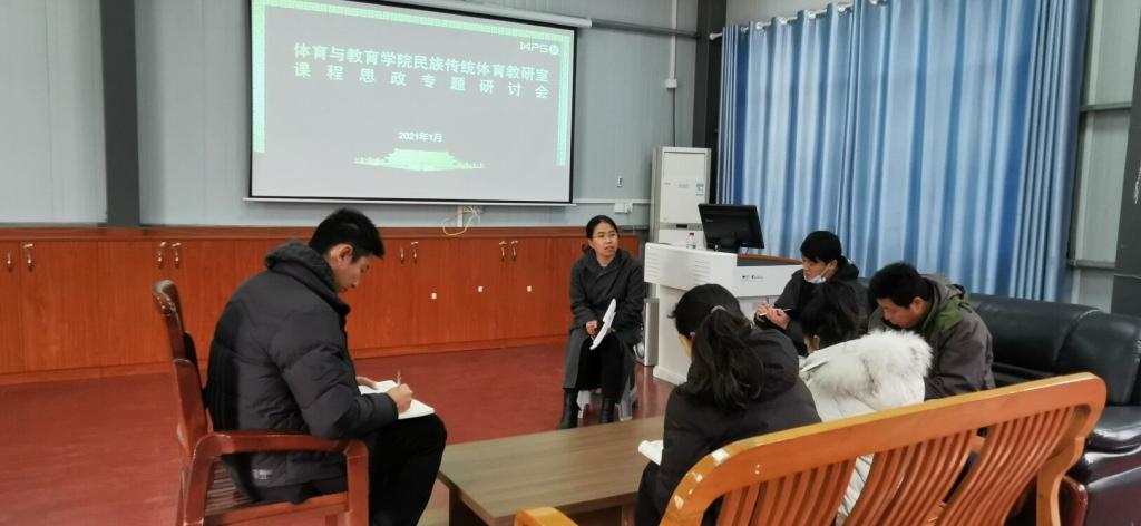2021年1月11日中午,体育与教育学院林月副院长到民族传统体育教研室进行课程思政专题调研和研讨。林月副院长从本专业的特点分析,指导民传专业的课程思政建设从哪个方面进行融入,如何在实际的课堂中运用,全体民族传统体育教研室的教师参与研讨会,接下来就是按照林月副院长的指导,从本专业的核心课程开始建设和融入课程思政元素,给学生正确的世界观、人生观和价值观。