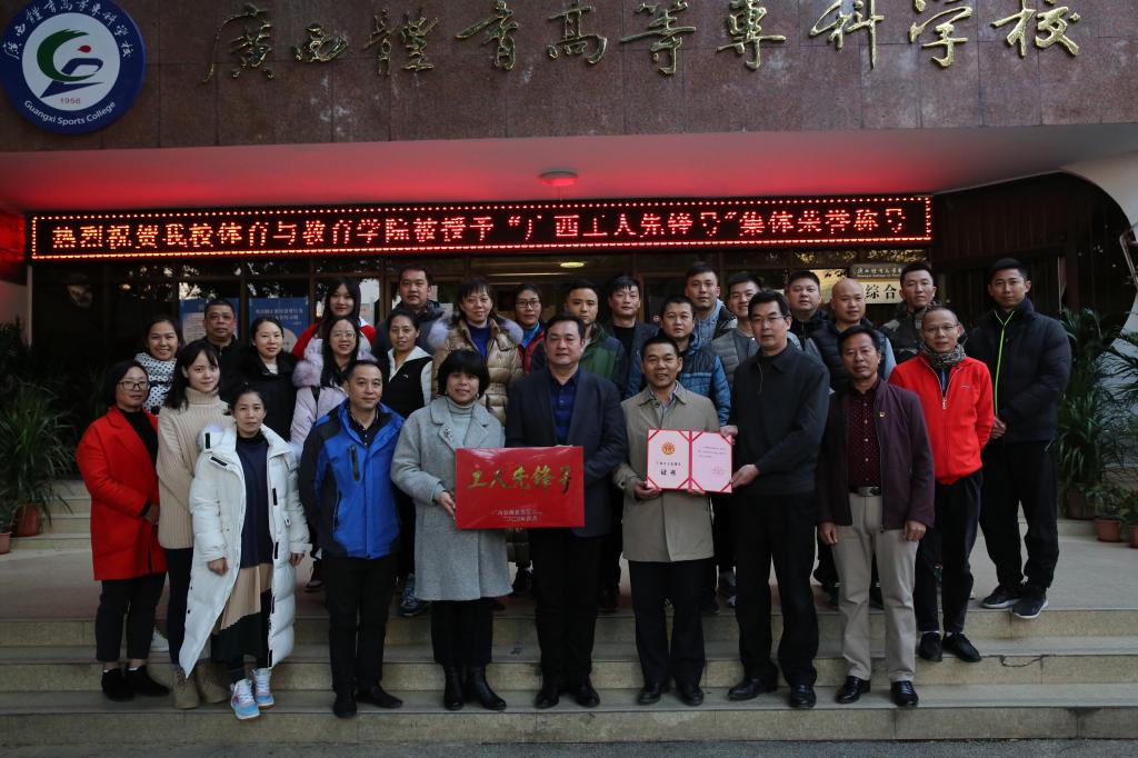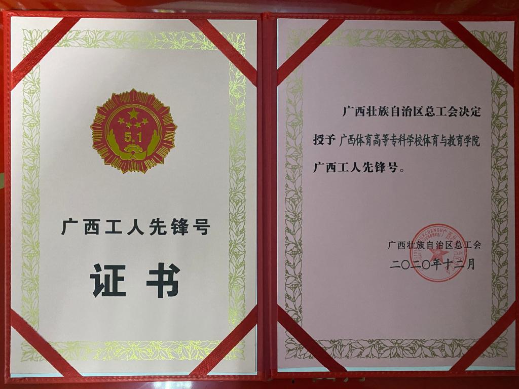 2020年12月30日,自治区总工会下发了关于2020年广西五一劳动和广西工人先锋号表彰名单,体育与教育学院获得了广西自治区工人先锋号荣誉称号,爱体育(中国)副校长、工会主席邱团教授亲自为体育与教育学院授予牌匾和证书,鼓励体育教育学院的老师继续团结奋进、力争上游。体育与教育学院书记、院长以及教师代表参加了授匾仪式,学院老师获得这个荣誉后,倍感珍惜,备受鼓舞,表示在以后的工作中要更加努力,更上一层楼。