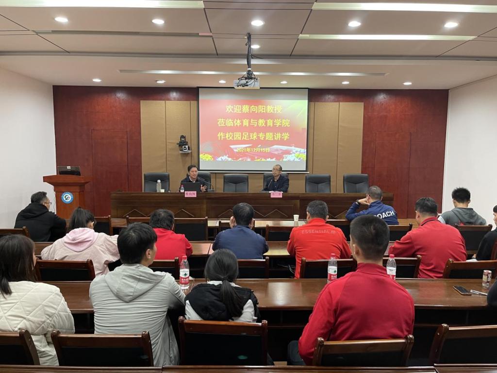 为推动爱体育电子官方网站校园足球改革发展,帮助学院足球教学、训练和推广活动的开展,2021年12月15日下午,应学院校园足球发展中心邀请,教育部校园足球专家委员会委员、中国大体协足球协会副主席、全国学生体育协会足球分会副主席、福建师范大学中意国际合作办学首席专家蔡向阳教授到校进行题为《体教融合背景下校园足球八大体系”建设的学习与思考》专题讲座,我院50余位师生代表到场聆听,讲座由院长韦军教授主持。