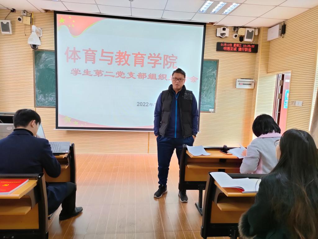 为深入学习贯彻习近平新时代中国特色社会主义思想和贯彻党的十九届六中全会精神,组织引导广大党员深刻认识“两个确立”的决定性意义,大力弘扬伟大建党精神。2022年1月12日,体育与教育学院学生第二党支部在综合楼301教室召开组织生活会和民主评议党员大会。学院党总支纪律委员、副院长兰政同志列席会议,会议由学生第二党支部书记蒋小翠同志会议,学生第二党支部全体党员出席了会议。