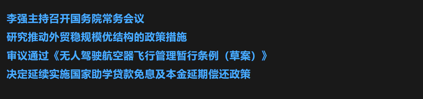 国务院总理李强4月7日主持召开国务院常务会议,研究推动外贸稳规模优结构的政策措施,审议通过《无人驾驶航空器飞行管理暂行条例(草案)》,决定延续实施国家助学贷款免息及本金延期偿还政策。