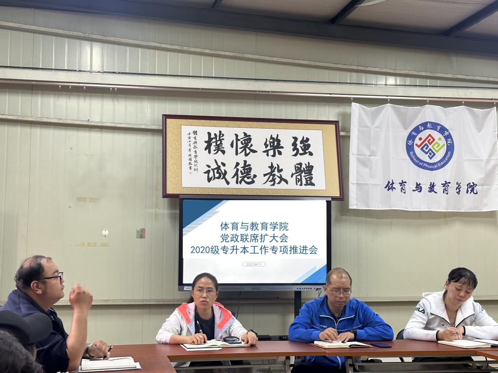2023年4月11日下午15:30,体育与教育学院于6201会议室召开党政联席扩大会,专题研究部署2020级毕业生专升本工作。会议由学院院长韦军主持,学院常务副院长林月作讲话,学院党总支副书记危泳键、副院长余晶作具体工作布置,学院教学秘书、行政秘书及全体辅导员参加此次会议。