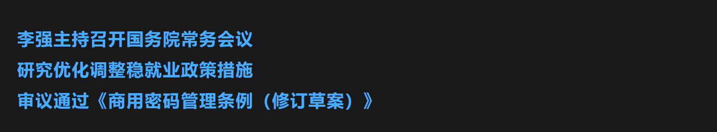 会议审议通过《商用密码管理条例(修订草案)》。会议指出,近年来,商用密码应用愈发广泛,在保障网络和信息安全、维护公民和法人权益方面的重要性日益凸显。要全面贯彻总体国家安全观,进一步规范商用密码应用和管理,督促平台企业依法履行用户密码保护责任,确保个人隐私、商业秘密和政府敏感数据的安全。要更好顺应数字经济快速发展趋势,建立健全商用密码科技创新促进机制,推动商用密码科技成果转化和产业化应用,促进商用密码市场持续健康发展。