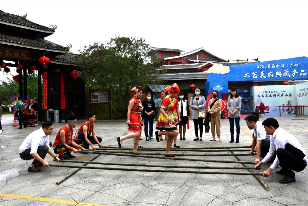 接着,党员们身着民族服饰,来到广西民族博物馆民族村,跳起欢快的竹竿舞,领略不同地区、不同风格的“三月三”习俗,感受壮乡瑰丽的民族文化。活动期间,南宁广播电视台对学院学生第三党支部书记和入党积极分子分别进行了采访。