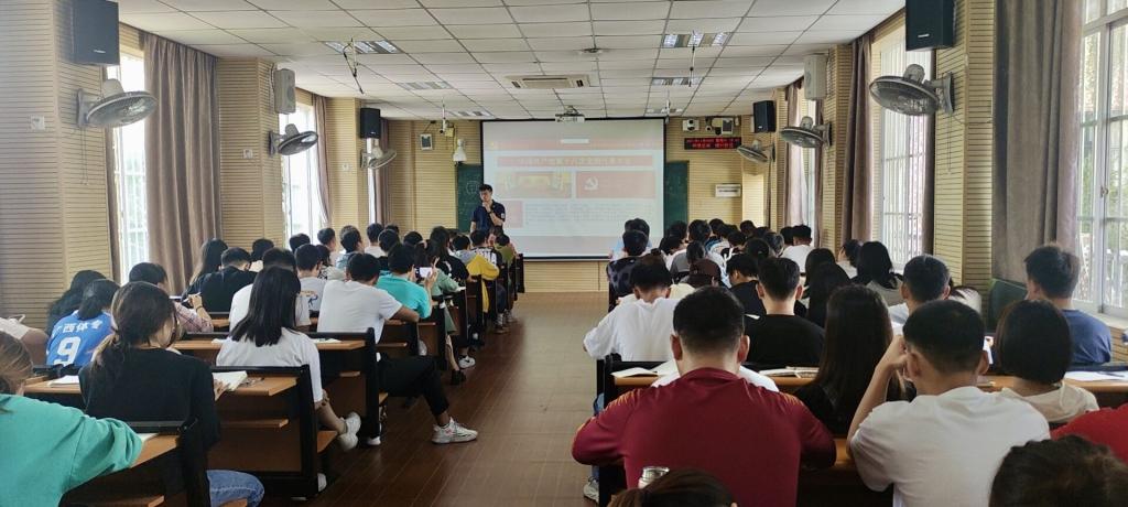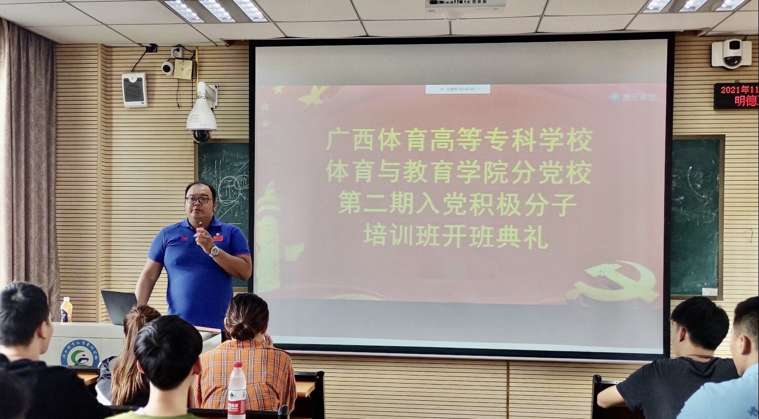 体育与教育学院党总支副书记危泳键参加开班典礼并致辞,体育与教育学院学生第一支部书记陈潜担任当天的授课教师。陈潜老师从:党的基本知识、习近平新时代中国特色社会主义思想、中国共产党百年光辉等内容展开讲授。