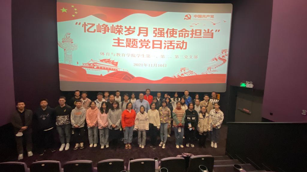 为庆祝中华人民共和国成立72周年,纪念中国人民志愿军抗美援朝71周年,丰富党史学习教育载体,进一步激发党员的爱国热情。 11月10日晚19:00,由体育与教育学院党总支危泳键副书记带领体育与教育学院学生第一党支部、第二党支部、第三党支部党员及学生预备党员,开展以“忆峥嵘岁月 强使命担当”为主题的《长津湖》观影党日活动。