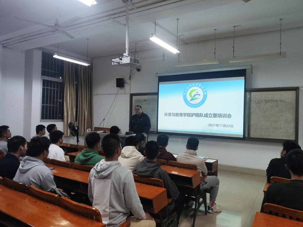 2021年11月22日晚,体育与教育学院护院队成立暨培训会在长岗校区瑞兴楼104教室召开,体育与教育学院学院党总支副书记危泳键出席会议,2021级辅导员组组长陆明主持会议。