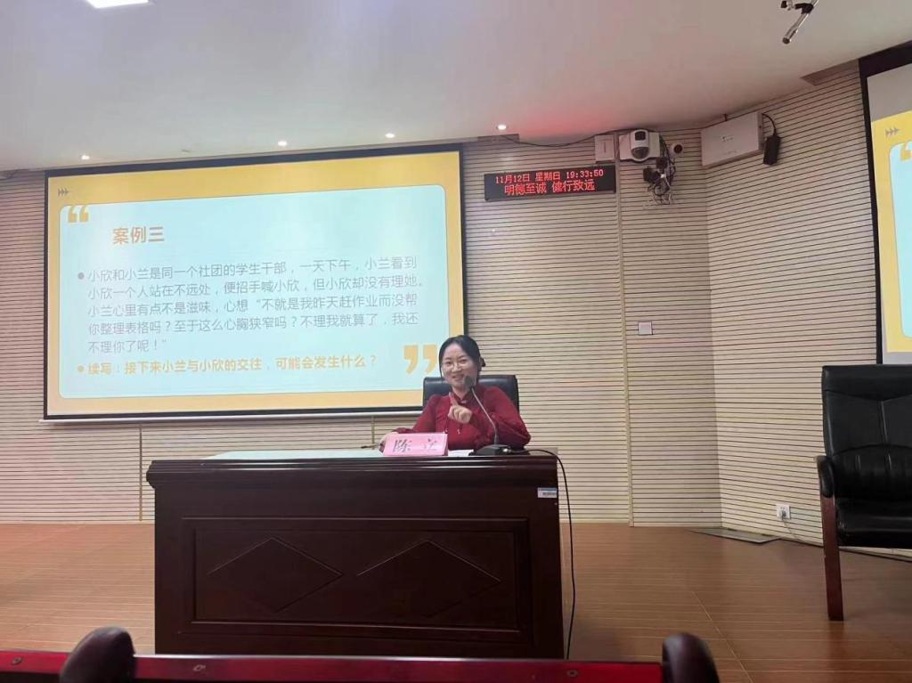 讲座上,陈立老师用生动形象的案例和幽默风趣的语言,详细分析大学生在人际交往中可能遇到的问题和挑战,并以案为鉴提供了应对策略和方法。
