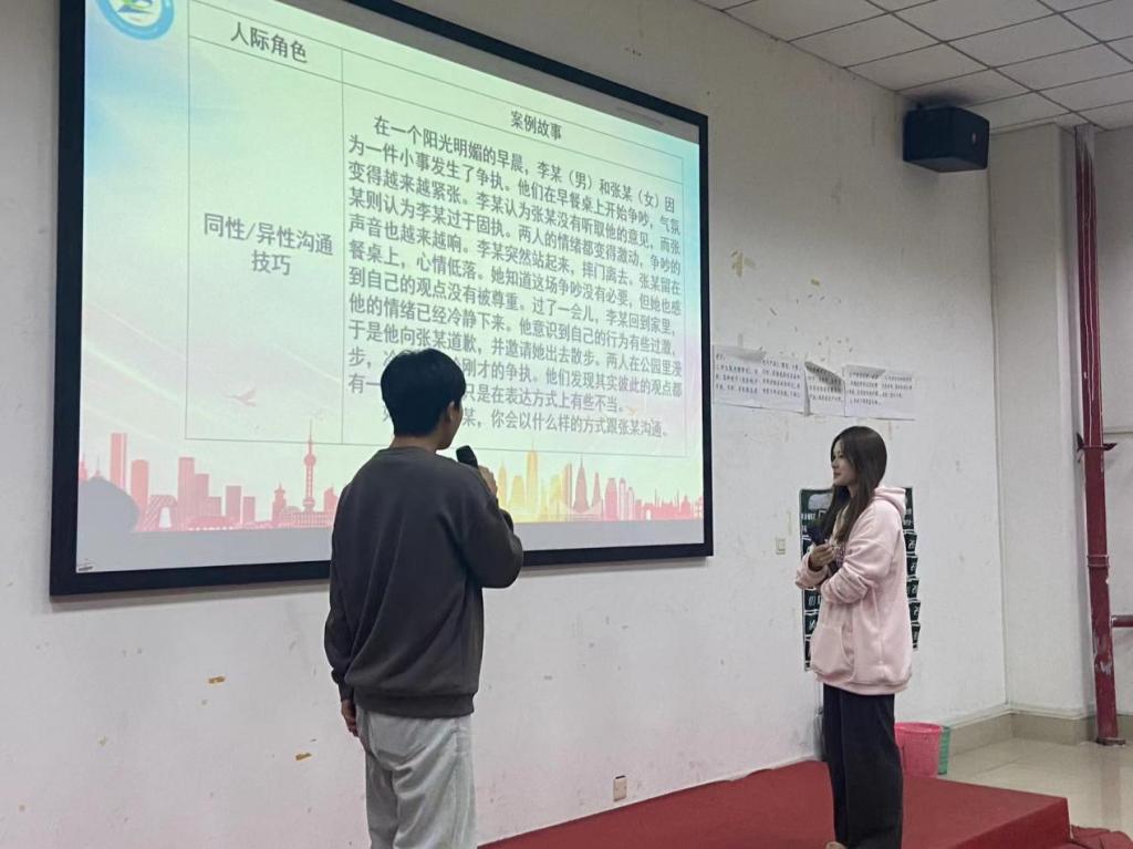 在角色扮演环节,授课老师演示了人际沟通的方法和技巧,同学们踊跃参与互动,在授课老师指导下进行沟通练习,基本掌握了大学生不同角色的沟通方法和技巧。