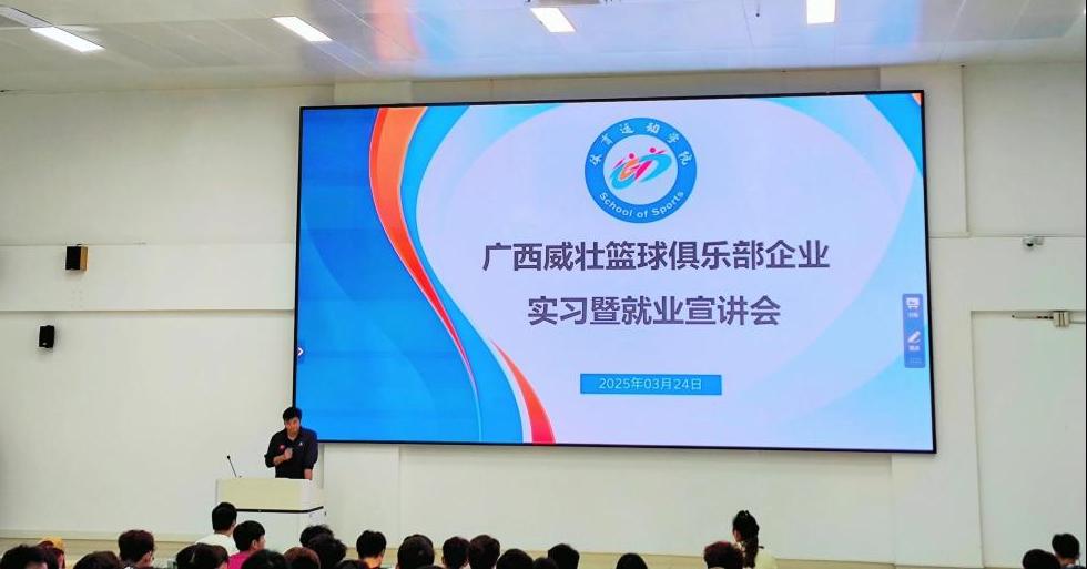 2024年3月24日晚,为深化产教融合,精准对接体育产业人才需求,体育运动学院与广西威壮集团联合举办校企合作洽谈会暨实习就业宣讲活动。广西威壮集团党委副书记、玉林党支部书记、集团商务总监及广西威壮篮球俱乐部总经理许超一行到校宣讲,为广西体育产业高质量发展注入新活力。