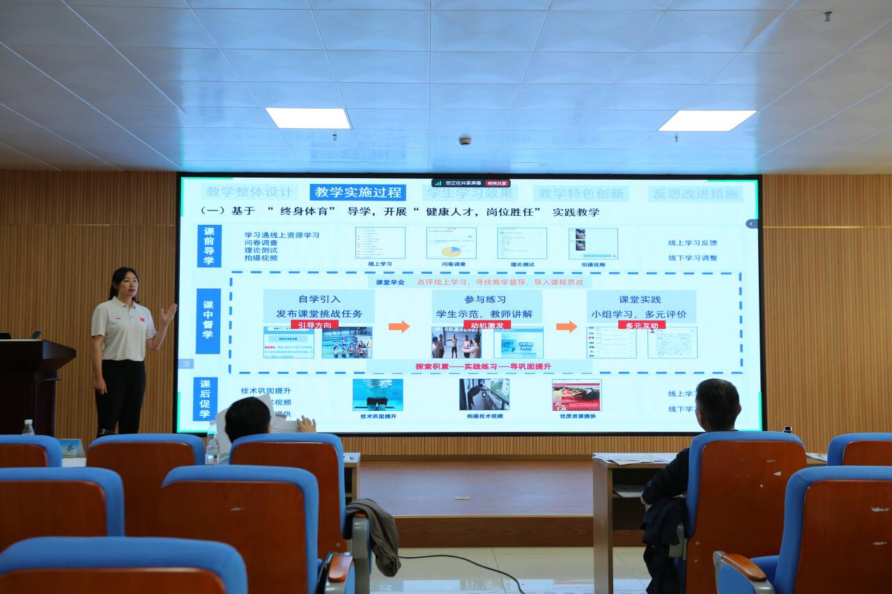专业课程一组的竞赛同样精彩纷呈。黄绍华副院长率领的游泳教学团队稳扎稳打,以扎实的教学功底斩获季军。尤为突出的是,我院篮球、排球、体能三支新锐教学团队首次参赛便实现历史性突破:篮球团队凭借"以球启智,以篮育才"的创新教学模式位列第七;体能团队聚焦"儿童青少年体能训练实操"课程开发,与排球教学团队并列第九。这些新晋力量在备赛过程中大胆突破传统教学模式桎梏,其精心打磨的课程方案既展现了开拓进取的创新精神,也为学院专项课程建设开辟了新路径,成为青年教师专业成长的标杆示范。