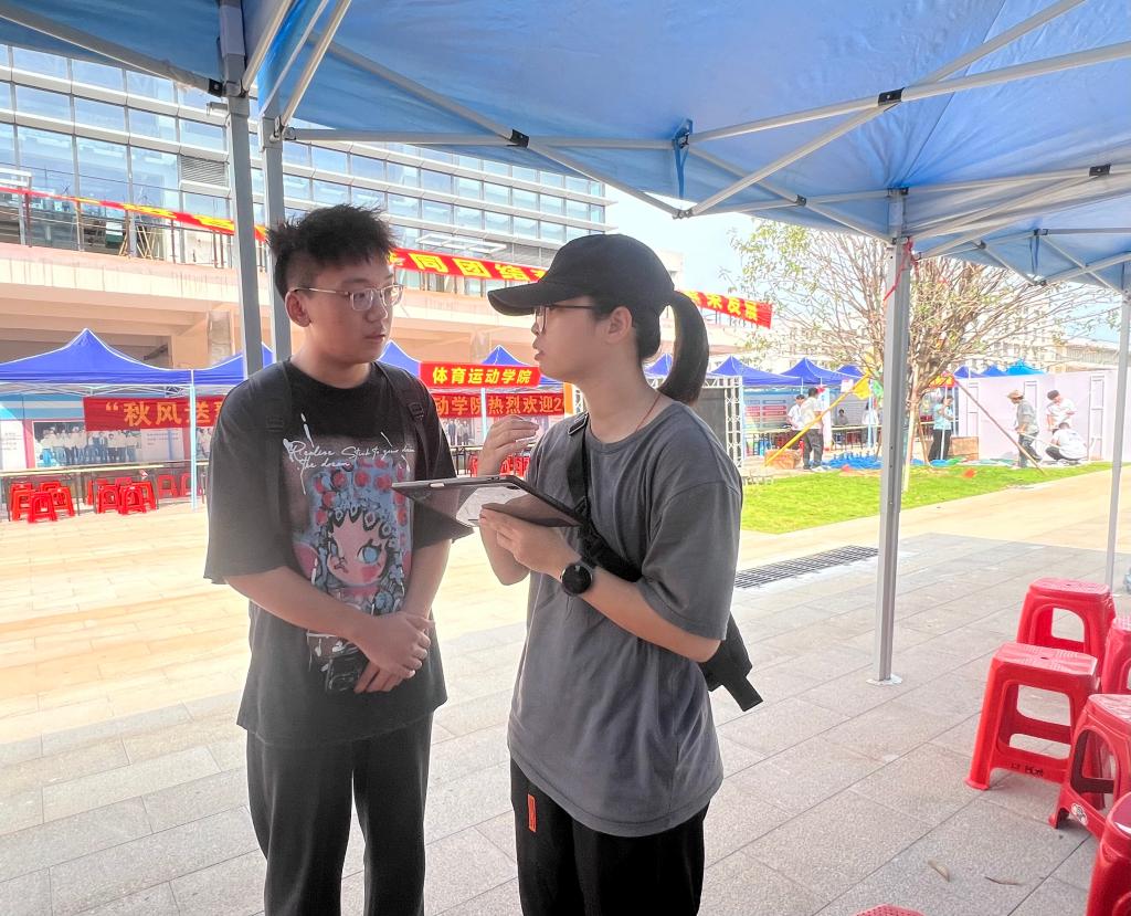 辅导员韦竺含老师(右)向新生(左)介绍学院情况