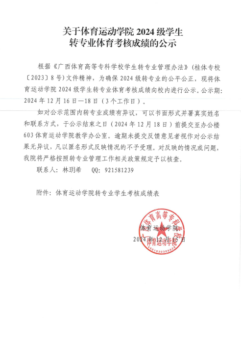关于体育运动学院2024级学生转专业体育考核成绩的公示