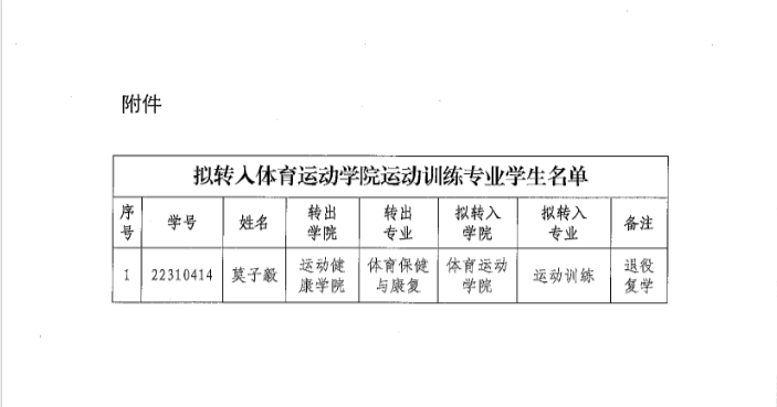 关于拟转入体育运动学院运动训练专业学生名单的公示