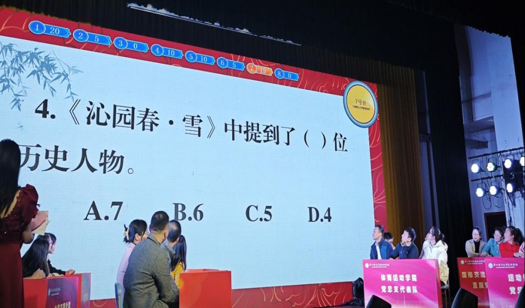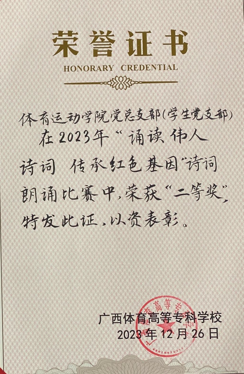 体育运动学院党总支部高度重视此项比赛,共组建3支队伍分别参加朗诵比赛和抢答比赛。经过前期认真筹划与用心排练,2023年12月26日,体育运动学院党总支部3支队伍在爱体育(中国)举办的“诵读伟人诗词 传承红色基因”诗词朗诵比赛中分别荣获1项二等奖、1项三等奖及1项优秀奖。