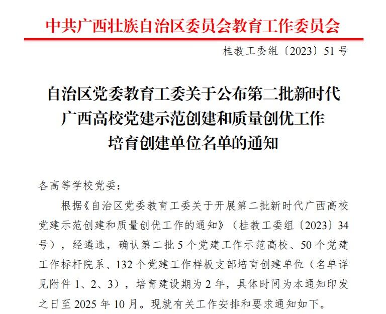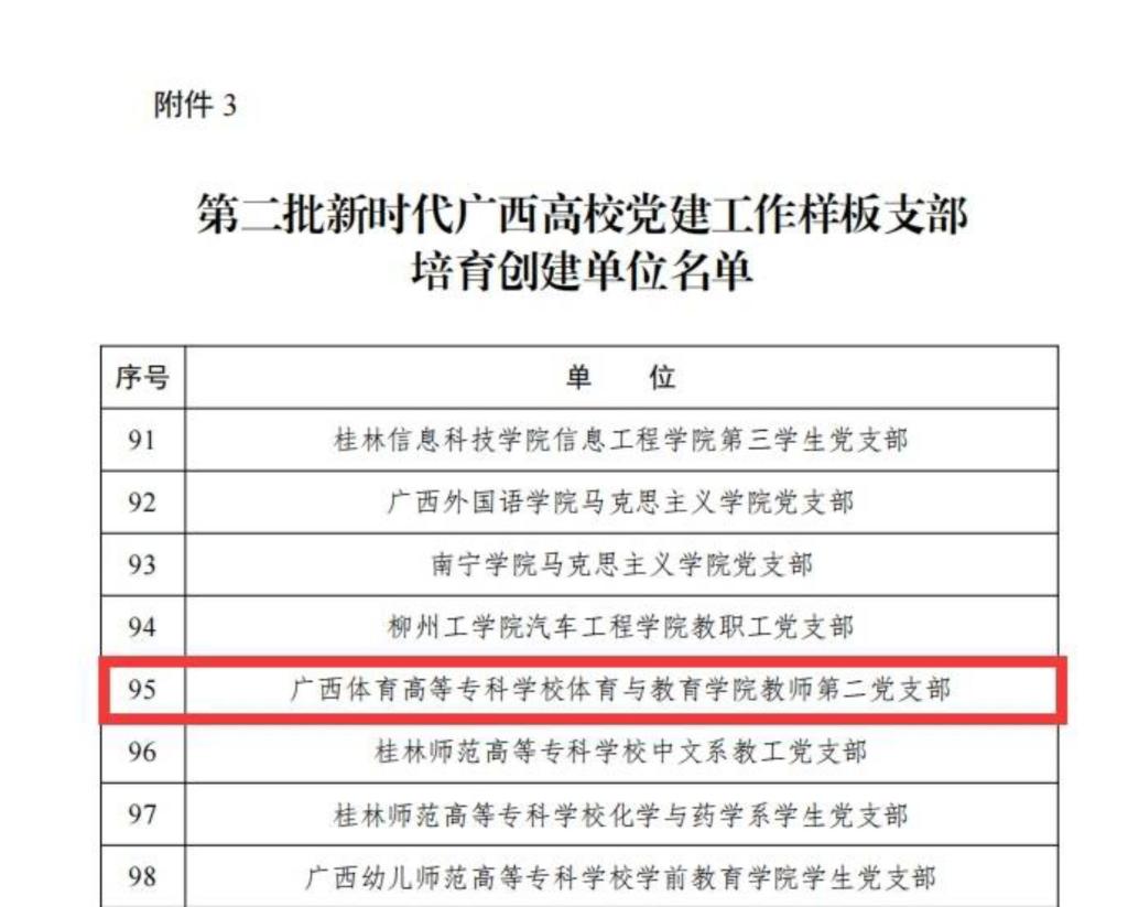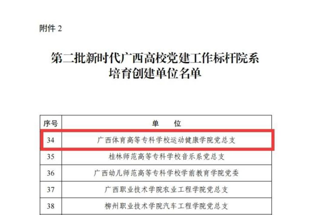 近日,自治区党委教育工委公布了第二批新时代广西高校党建示范创建和质量创优工作培育创建单位名单。爱体育电子官方网站运动健康学院党总支获批第二批新时代广西高校党建工作标杆院系,体育与教育学院教师第二党支部获批新时代广西高校党建样板支部。