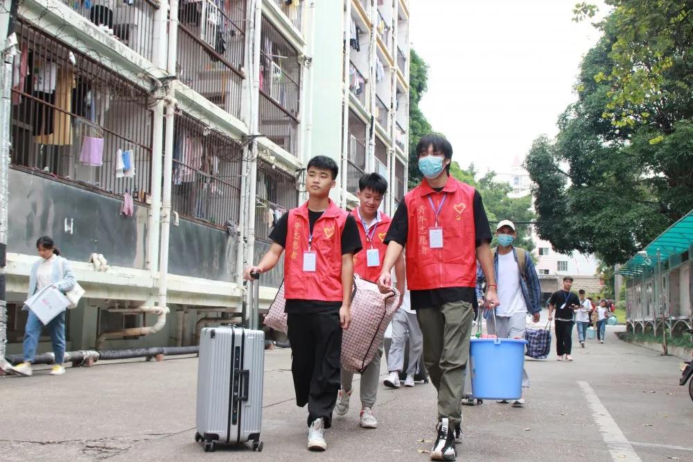志愿者身着红色志愿者服,凝聚成这个秋天红色的回忆。他们积极投入工作,带领新生到报到处报到,帮助新生搬运行李,解答新生疑惑。帐篷下,学姐们耐心指导新生填写资料。