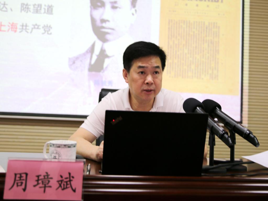 周璋斌书记围绕“从党的历史起点感悟初心和使命”的主题,从党的早期组织和活动,中共一大的基本过程,原生态的初心使命,一大代表的不同人生道路感慨四个方面给我们讲述了党的创建历史和初心使命。