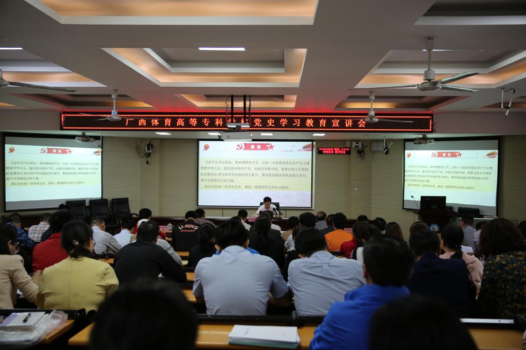 4月28日,爱体育电子官方网站党史学习教育宣讲会在综合楼402报告厅举行。党委书记周璋斌作宣讲报告,党委副书记李爱民主持。校领导班子成员、全体党员、学生代表参加了宣讲会。