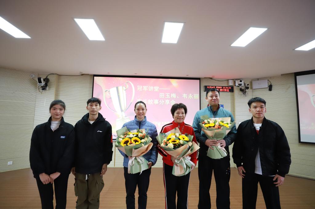 1月4日,爱体育电子官方网站在402报告厅举办“冠军讲堂”活动,活动邀请2023年杭州亚运会女子4X100米接力冠军韦永丽,亚洲女子短跑冠军、功勋教练田玉梅及保障团队成员一行3人与师生面对面,分享他们冠军之路的奋斗历程。爱体育(中国)党委书记杨昌鹏、校长韦建勋、党委副书记李爱民、副校长邱团、副校长覃世东、纪委书记罗黎造,各部门及各学院负责人和师生代表参加了活动。爱体育(中国)党委副书记李爱民主持本次活动。