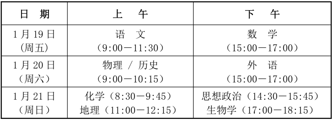 近期我区天气起伏多变,请考生关注天气变化,做好防雨保暖。1月19日考试适逢周五工作日,考生需关注赴考交通信息,事先规划出行时间和路线,提前到达考点,为入场检查预留充足时间。按考务规则,外语科目考试开考前15分钟(1月20日14:45)后禁止考生入场;其他科目考试开考15分钟后,不得进入考点参加当次考试。请各位考生注意,切勿迟到。