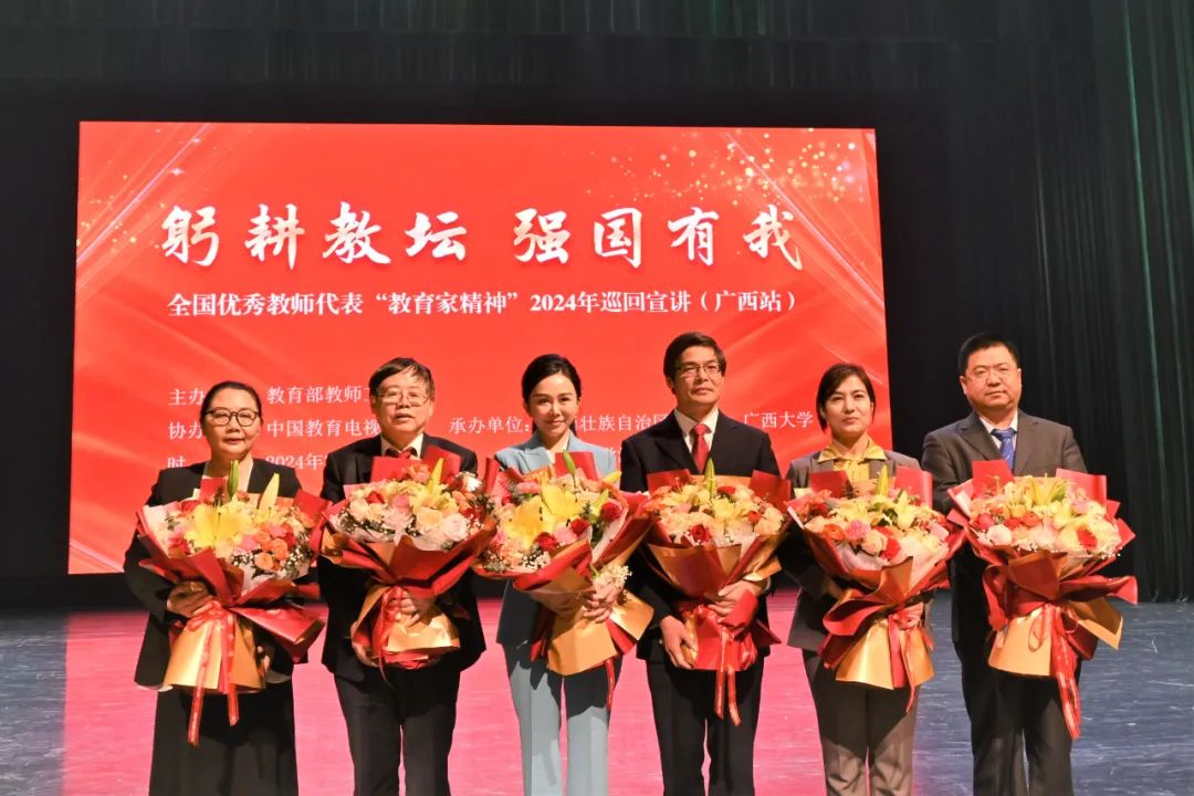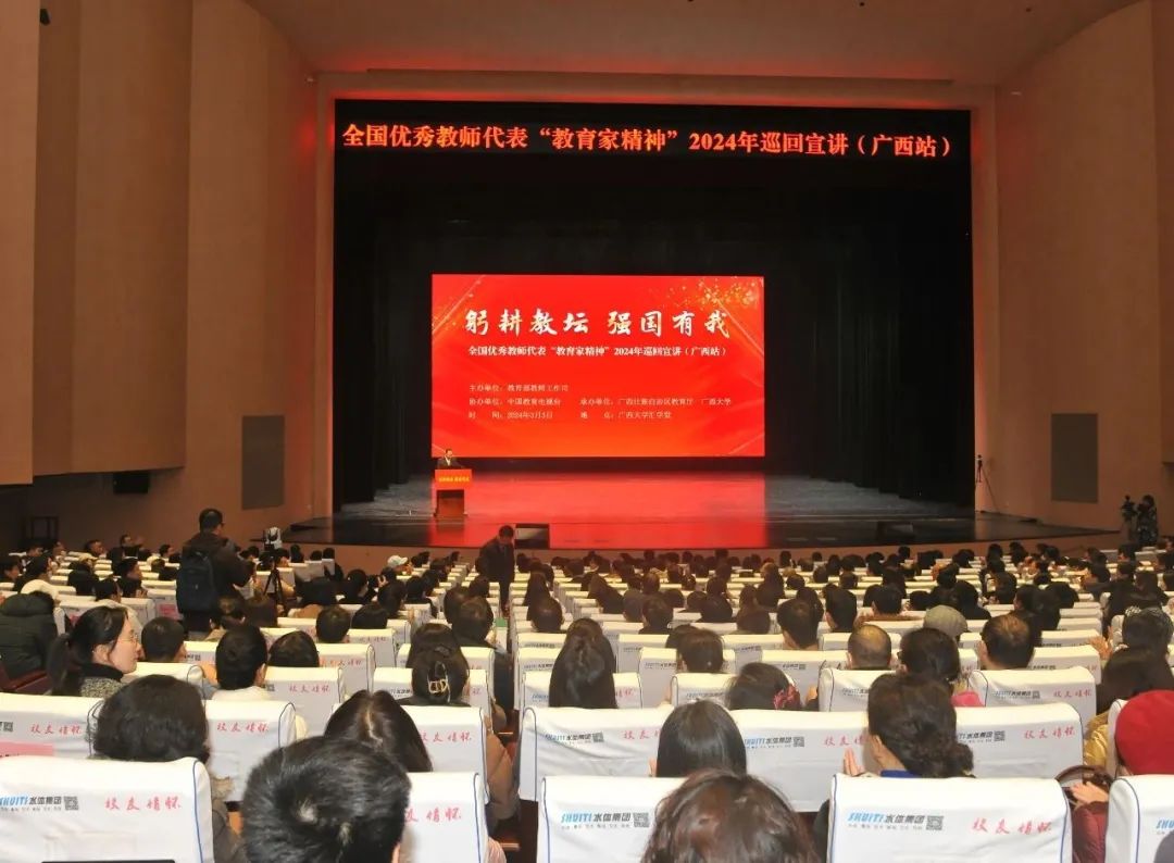 据了解,此次巡回宣讲由教育部教师工作司主办,中国教育电视台协办,广西壮族自治区教育厅、广西大学承办。宣讲以“弘扬教育家精神、争做新时代大先生”为主题,由高等教育、中小学教育、学前教育、职业教育、特殊教育等领域中的全国教书育人楷模、全国最美教师等优秀教师代表共25人组成,宣讲团分为4个组,分别赴河北、黑龙江、江苏、浙江、山东、湖北、湖南、广东、广西、四川、甘肃、新疆等12个省份开展巡回报告。广西壮族自治区教育厅以此次宣讲为契机,进一步推动全区师生向楷模学习、向优秀看齐,用身边人身边事,激发广大教师树立“躬耕教坛、强国有我”的志向和抱负,积极弘扬践行教育家精神,奋力争当“四有”好老师和时代“大先生”,为培养德智体美劳全面发展的社会主义建设者和接班人贡献力量。
