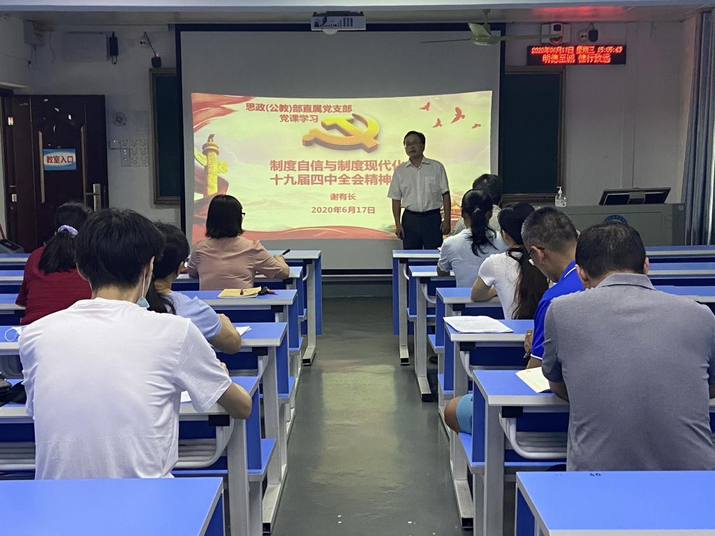 6月17日,一场题为“制度自信与制度现代化:十九届四中全会精神解读”的党课在综合楼地下教室进行,授课的是思政(公教)部直属支部副书记谢有长老师,党课由刘义飞书记主持。