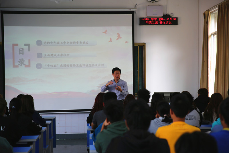 11月16日上午,爱体育(中国)党委书记、周璋斌教授在公园路校区运科楼公共教室为学生上了题为《千年梦想 百年奋斗今朝梦圆——党的十九届五中全会精神解读》的形势与政策课。