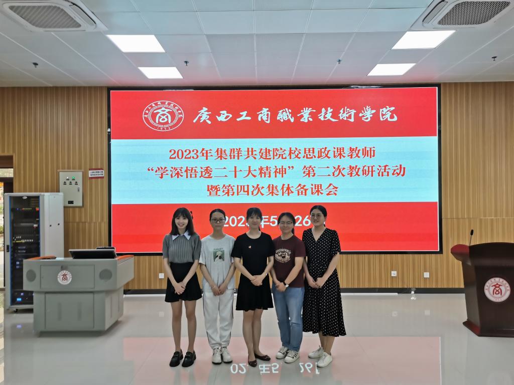 5月26日下午,我院思政课教师赴广西工商职业技术学院武鸣校区参加2023年集群共建院校思政课教师“学深悟透党的二十大精神”第二次教研活动暨第四次集体备课会。本次活动由广西工商职业技术学院马克思主义学院承办,参加活动的还有广西国际商务职业技术学院、广西信息职业技术学院、广西科技职业技术学院、广西制造工程职业技术学院、防城港职业技术学院、广西英华国际职业学院等集群共建院校的马克思主义学院思政课教师。