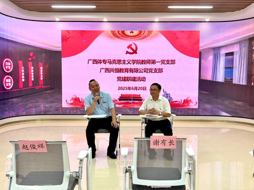 在中国共产党成立104周年来临之际,为加强党员党史学习教育,锤炼党性修养,马克思主义学院教师第一党支部与广西共恒教育有限公司党支部于6月20日在爱体育电子官方网站党建思政教育基地开展“学党史 悟初心”主题党日活动和党建联建活动。两个支部的书记、委员及党员参加了活动。