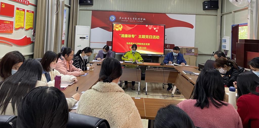 为进一步加强学院党风廉政建设,弘扬清风正气,引导党员增强廉洁自律意识,筑牢拒腐防变思想防线。12月14日下午,马克思主义学院党总支在马院会议室开展“清廉体专”主题党日活动。活动由学院党总支书记黎竹娟主持,学院全体党员参加活动。