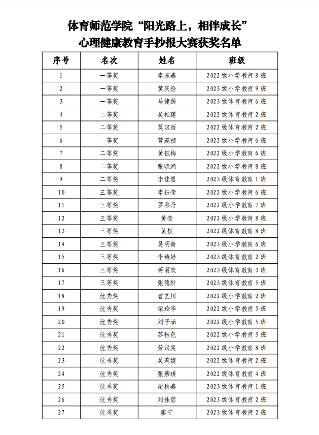 “阳光路上,相伴成长”心理健康教育手抄报大赛获奖名单