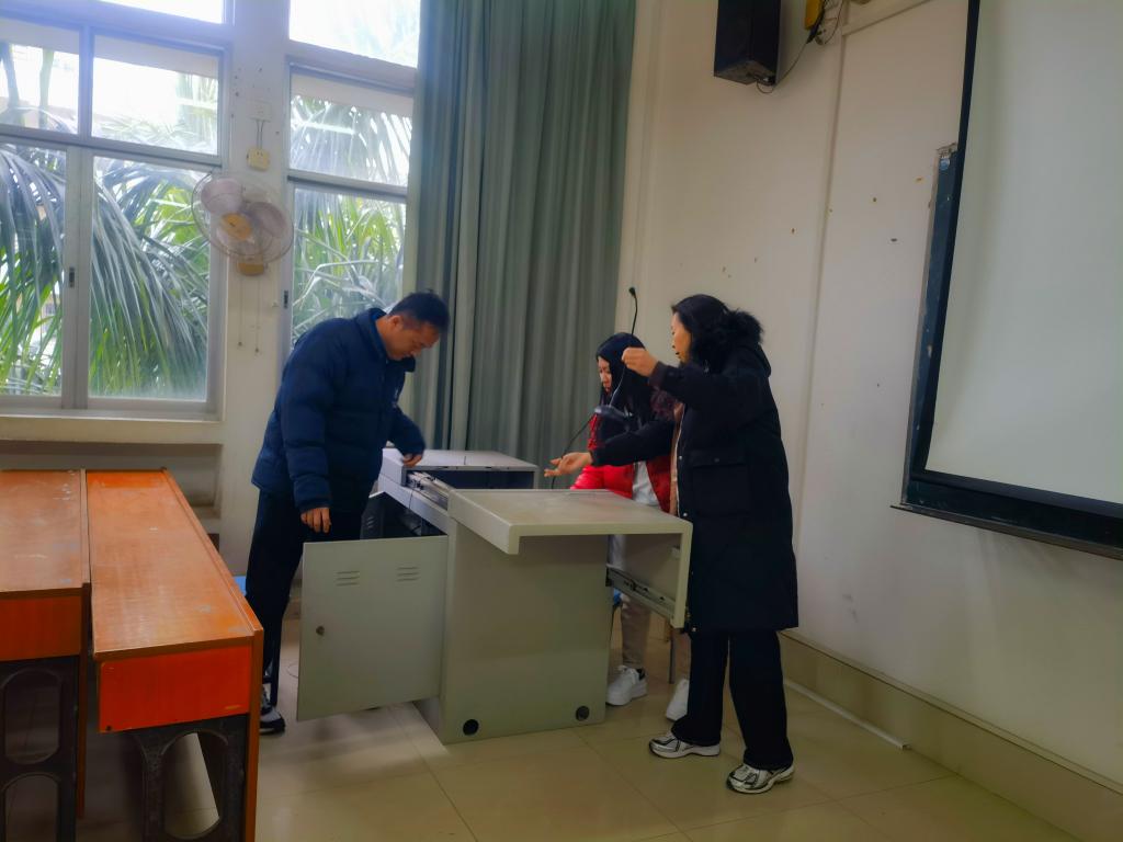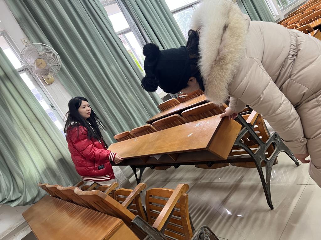 检查学院多媒体教室损坏的桌椅