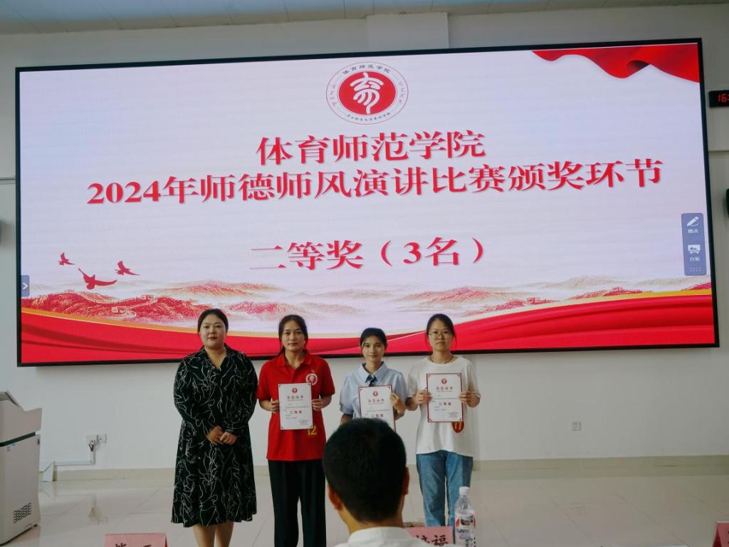 体育师范学院2023级辅导员毕玉老师为二等奖获得者梁土妹、黄柳盈、罗秀平颁奖