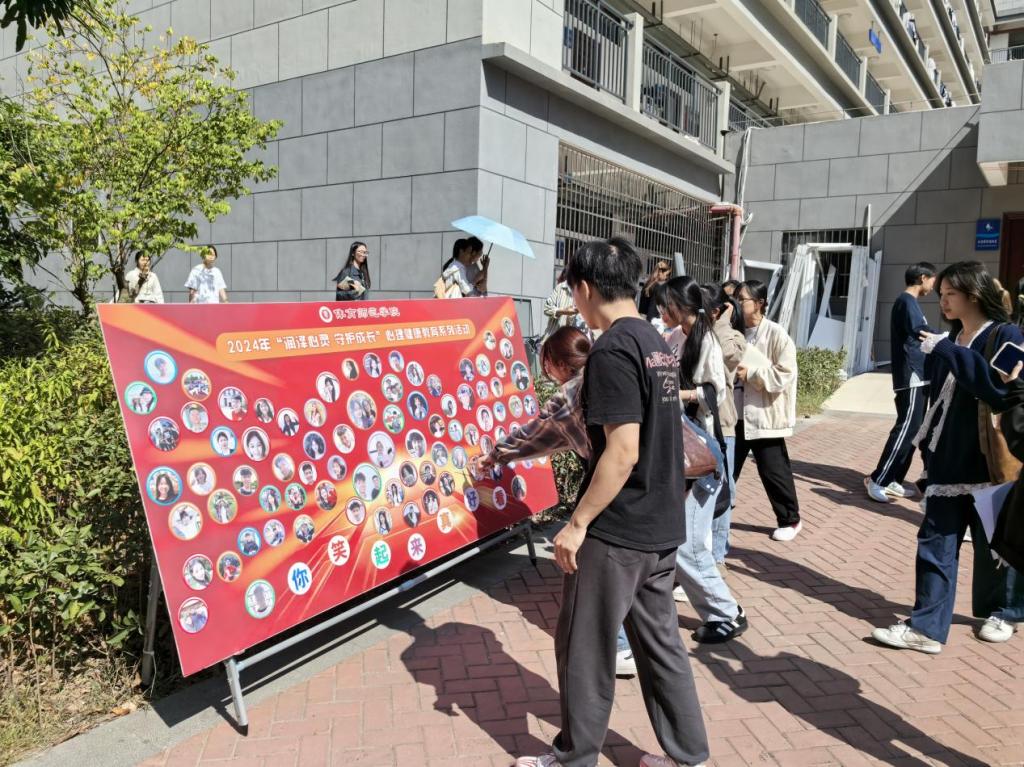 学生纷纷驻足欣赏最美笑容照片