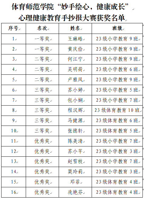 “妙手绘心,健康成长”心理健康教育手抄报大赛共征集了31份作品,最终评选出一等奖2名、二等奖3名、三等奖5名、优秀奖6名,共计16份优秀作品。