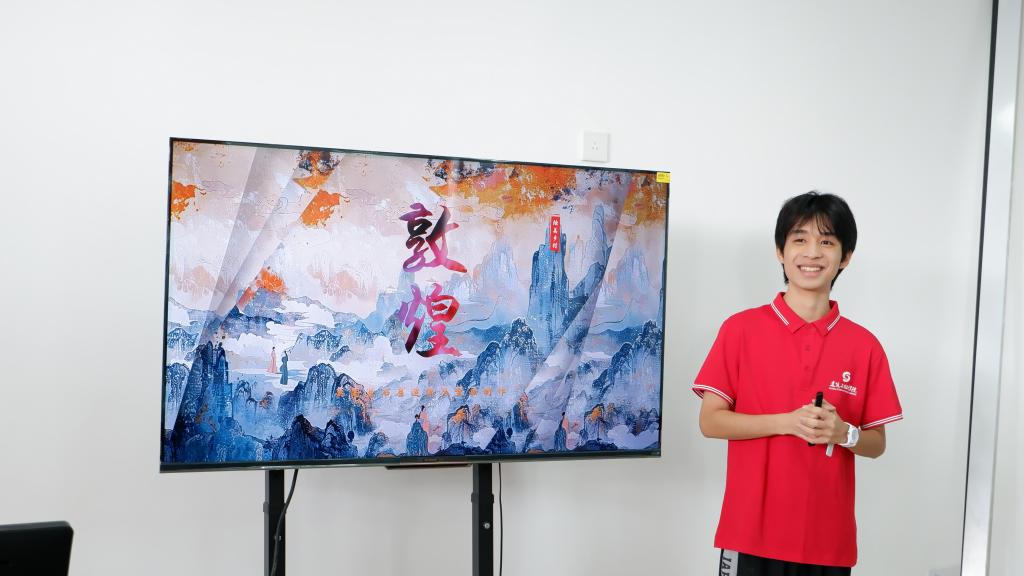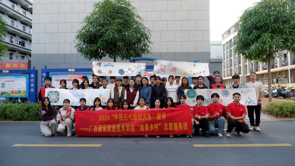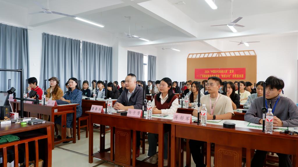 广西建设职业技术学院“绘美乡村”志愿服务团成员刘吕豪讲解敦煌莫高窟造像及壁画制作