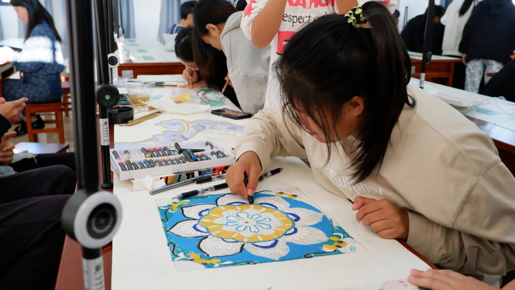 在了解了莫高窟的知识后,活动进入了实践操作环节。建筑与规划学院辅导员贾琪钰示范了如何绘制莫高窟风格的壁画,她从构图、线条、色彩等方面进行了详细讲解。随后,我院师生们纷纷拿起画笔开始创作,沉浸在绘画的世界中。