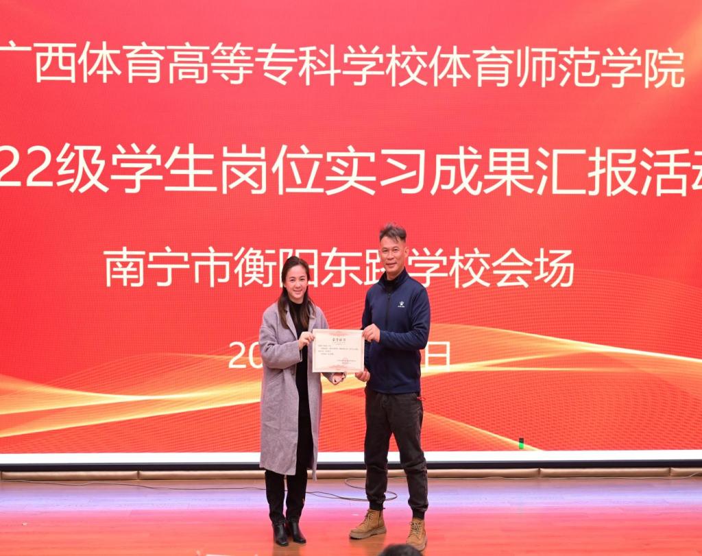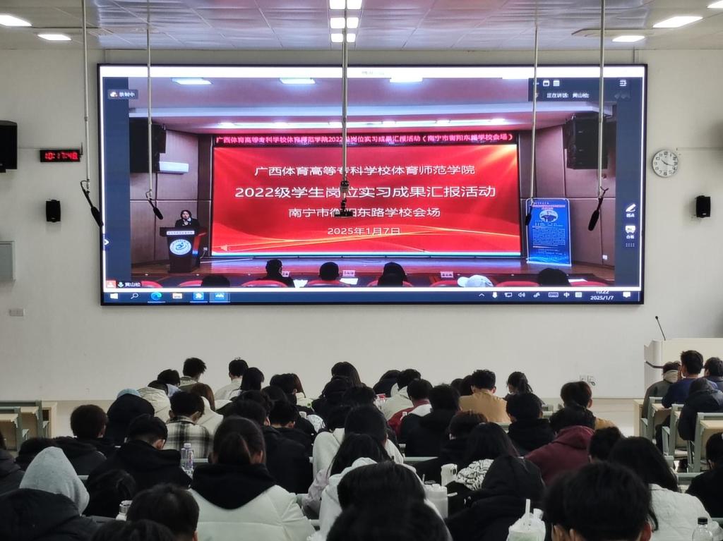 2025年1月7日上午,体育师范学院在南宁市衡阳东路爱体育(中国)开展的2022级学生岗位实习成果汇报活动取得圆满成功。此次活动旨在总结学生实习进展,展示实习成果,进一步激发学生的实践热情、创新思维和职业能力探索。南宁市西乡塘区教育局体育室主任黄漫、南宁市衡阳东路爱体育(中国)副校长韦慧霖、南宁市万秀小学教师蒙碧燕、南宁市衡阳东路爱体育(中国)教师刘晶晶、体育师范学院院长苏祝捷、副院长祁丽、体育教育专业负责人覃云飞和小学教育专业负责人杜欢出席本次活动,学院教师及2023级100多名学生代表现场观摩。同时,学院还组织2022级和2023级近1000名学生在爱体育(中国)相思湖校区教学楼南楼101教室和301教室以观看在线直播的形式观摩学习。