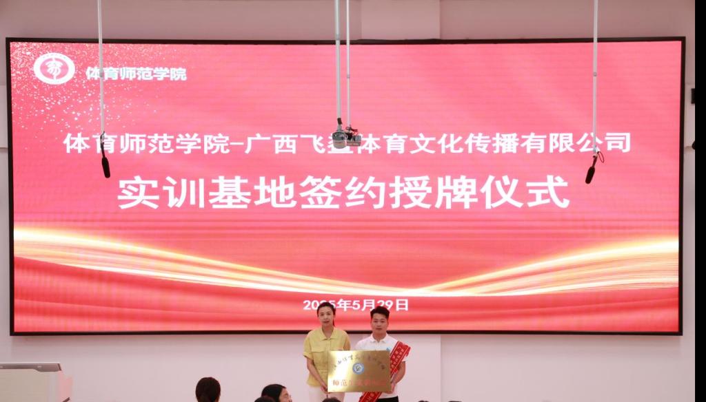据悉,体育师范学院与广西飞鲨体育文化传播有限公司共同签订校外实习实训基地协议和颁发师范生实训基地牌匾,校企将整合双方资源,在实习、实训、就业等方面展开合作,提升学生职业能力、职业素养和就业竞争力,实现校企互利共赢。