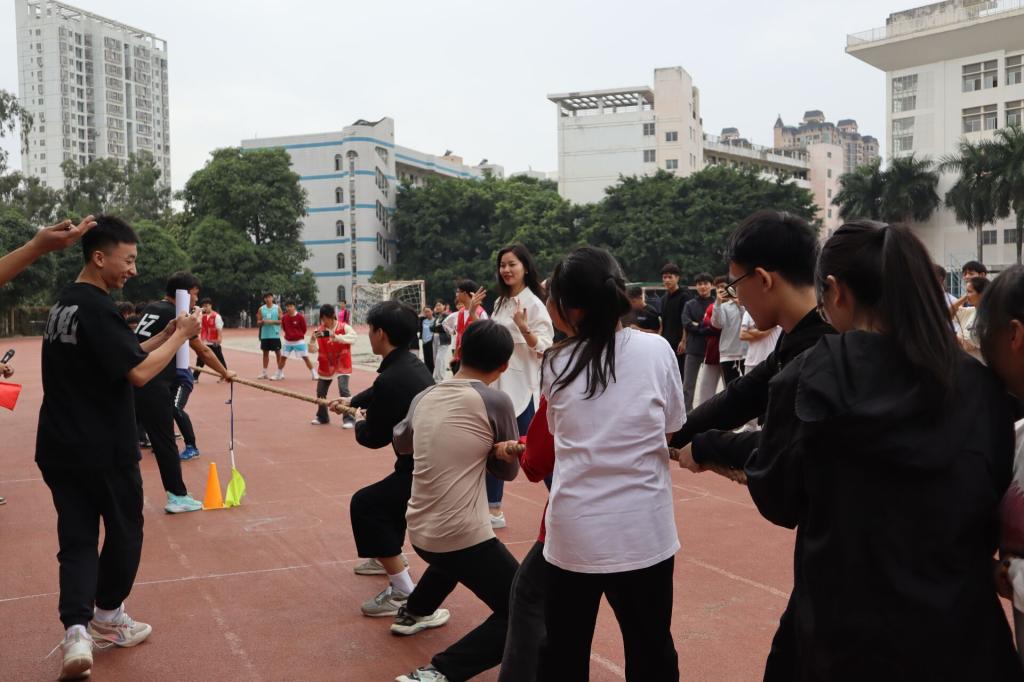 拔河比赛,是最能体现团队协作、激情张力及毅力拼搏的一个项目。比赛中,参赛队员们紧握长绳,聚焦麻绳中点,齐心协力、一同发力。观赛的师生自发组成啦啦队为队员们加油鼓劲,哨子声、加油声、呐喊声此起彼伏,响彻赛场。