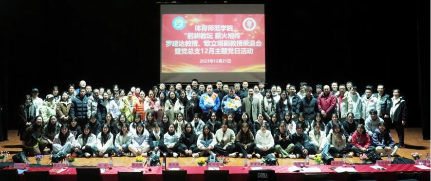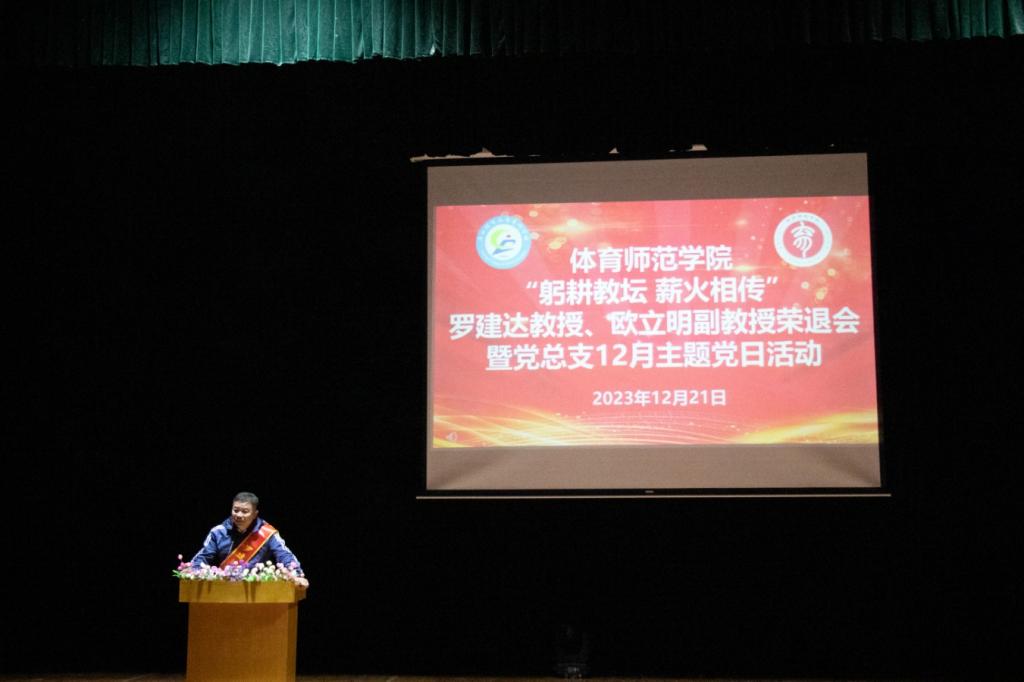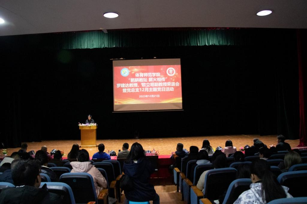 12月21日上午9时,体育师范学院在长岗校区瑞兴楼演播厅举办“躬耕教坛 薪火相传”罗建达教授、欧立明教授荣退会暨党总支主题党日活动。本次主题党日活动由学院党总支书记黎竹娟主持,学院全体领导班子成员、全体党员、教职工以及学生代表共150余人参加。