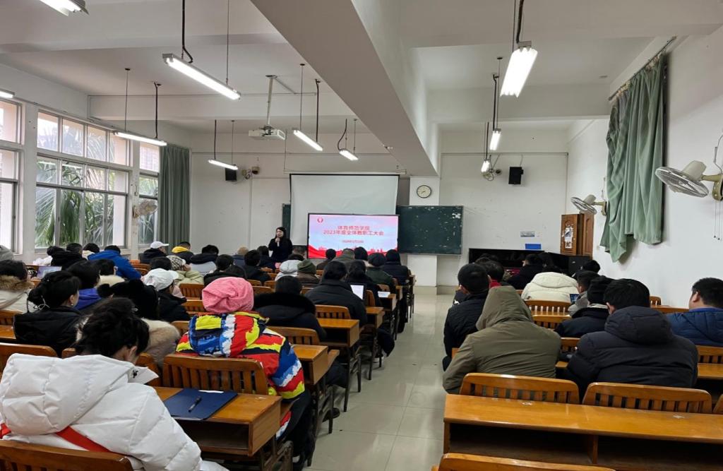 首先,苏祝捷院长对本学期学院党建引领下各项工作进行梳理总结,专业建设、课程建设、教学研究、教学技能比赛及行政事务稳步推进;全力抓好招生就业、专升本等各项工作,学生工作特色化、品牌化建设有声有色。一是专业建设有成效,体育教育专业群入选自治区新一轮高水平专业群建设名单。二是重视队伍建设,晋升教授2人,副教授资格4人,讲师6人,引进博士2人,自培攻读博士学位2人,攻读硕士学位1人,5人通过校级“双师型”认定,10人通过区级“双师型”认定。三是团队合力提质量,学院共有教师73人次获56个省级以上奖励。《教育学》《小学语文教学设计与实施》2门课程获得认定为自治区级思政示范课程;师范生技能大赛获省级一等奖;《运动人体科学基础》课程申报自治区级精品在线开放课程;《教育学》课程获代表爱体育(中国)参加自治区青年教师教学竞赛评选。四是学院申报获批广西教育科学重点研究基地培育单位,新增承担重大研究项目1项,专项课题1项。市厅级科研项目立项5项,结题3项。五是课程建设有收获,《教育学》获青年教师教学竞赛一等奖,《教育学》等3门课程获得认定为校级课程思政示范课程。《健身健美操》《羽毛球》等5门课程获立项校级精品在线开放课程;《教育学》等3门课程获得认定为校级示范课。六是获得标志性成果奖励(56项),并按时按质开展内部质量保证体系诊断与改进工作。七是建立“12345”特色育人工作体系,开展20余项校园文化活动,推进“第二课堂成绩单制度”创新改革。八是选优配强驻村第一书记1名,培育乡村振兴工作品牌。